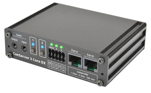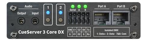 The CueServer 3 Core DX variant (CS-3150) additionally features two built-in isolated RJ45 DMX ports that can be configured as either DMX Inputs or Outputs. The DX model includes expanded I/O features including contact closure inputs, digital outputs, RS232 serial, user-definable function buttons with RGB indicators, and stereo audio input/output for playing sound effects or music, or SMPTE timecode input.